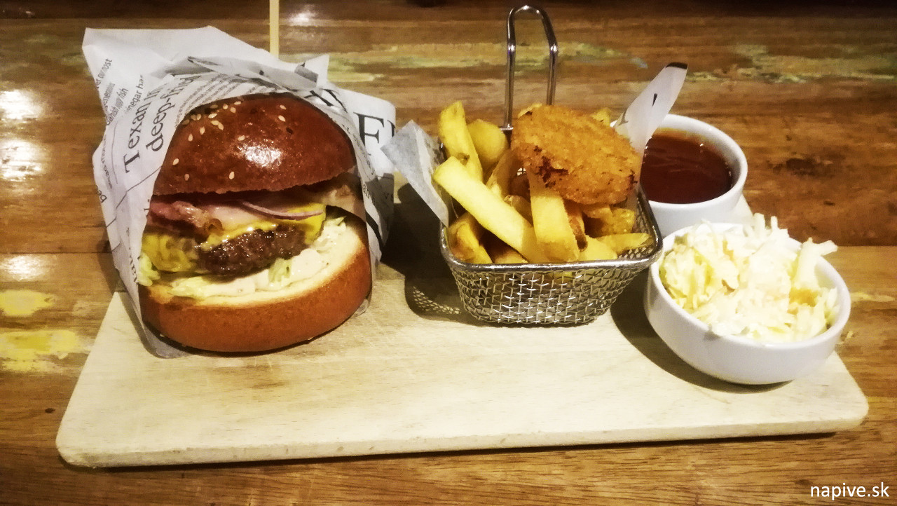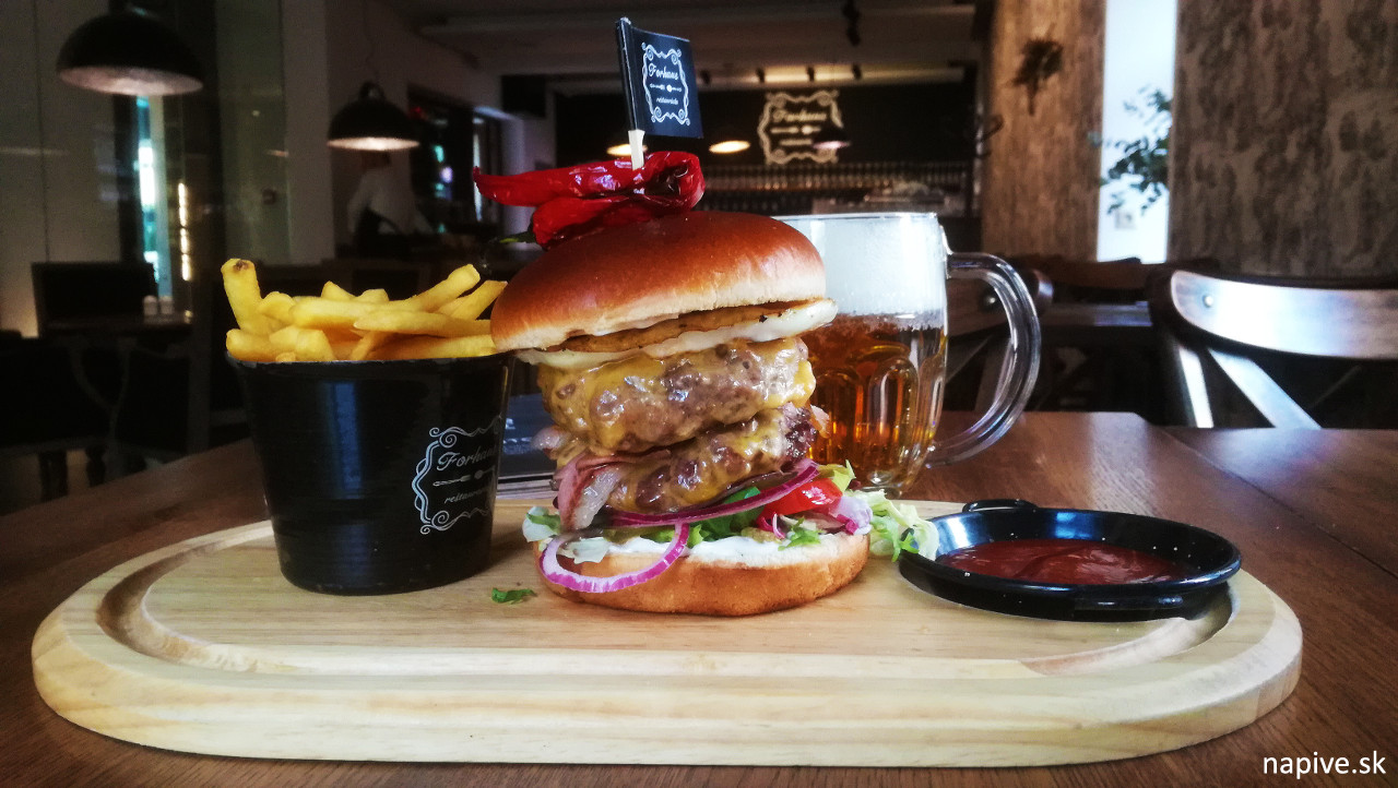 Forhaus domáci burger. Iba jeden burger v celkom pestrom lístku, kde je dosť grilovania a údeného… ale aj zdravších vecí. Je to druhý najhorší burger v Trnave a vysvetlím aj prečo. Pretože stál 11,90 – skoro dvakrát toľko ako iné burgre. A k tomu tie najobyčajnejšie z obyčajných hranoliek… a najobyčajnejší kečup. To naozaj? Fajná reštaurácia na fajnej historickej ulici, kde sa vidno snahu a na stole mi pristane niečo, čo si viem za pár centov osmažiť aj sám. Teda… burger samotný nebol zlý. Vidíte ho na obrázku – poschodový double, ktorý som zjedol na dvarazy. Volské oko a slaninku hore, cibuľu a uhorku dole. Do putovania za burgrami som vložil veľa energie, času a cestovania a od toho najlepšieho som nečakal, že to odfláknu :).