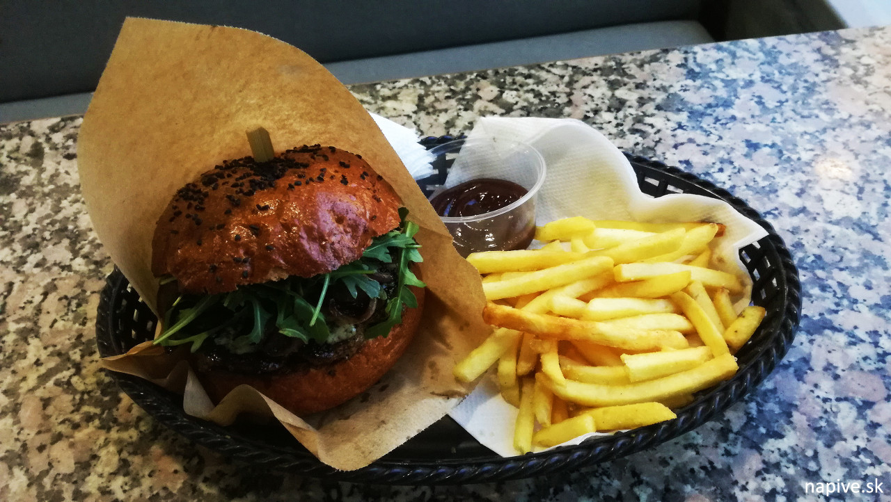Merkur špeciál burger s medvedím cesnakom. To najlepšie na hornom obrázku. Určite najlepší pomer cena-výkon, aj s hranolkami to stálo „len“ 8,90 euro , čo ozaj v tomto žánri nie je veľa. Tento burger je sezónny… videl som lokšu alebo chlebíček s medvedím cesnakom a potvrdzujem, že v burgri sa to veľmi hodí (aj do omáčky, aj ako šalát). V Prahe v redakcii iDnes už začali šíriť paniku, že príroda toľký zber medvedieho cesnaku neprežije :P. Majú proste svoj svet. Trnavský Merkur je socialistická architektúra na socialistickom sídlisku, kde ešte kul pikle okresný tajomník strany proti krajskému. Ale. Pub je pekne prerobený, s fajnovým lístkom a jemnou rockovou muzikou na obed. Tento burger skrátka vyhral – zmestil sa do orálu, bol kompaktný, syrový plátok bolo dobre cítiť a hranolky boli domáce.