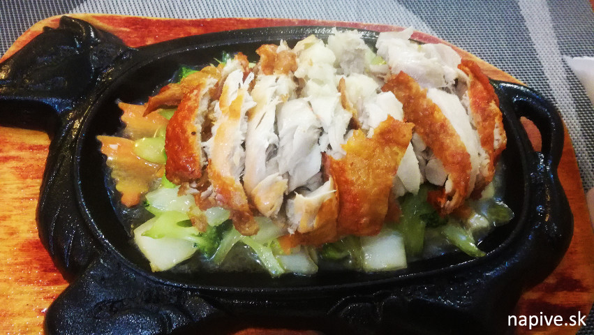 V lístku ukazujem na opečenú kačku so zeleninou a hríbkami. Čašník sa na 20 minút vytratí… a nakoniec mi donesie to, čo vidíte hore na obrázku. Ehm, červené pokrájanú kačku, tri palacinky a je to na nejakom hnedom maglajze, aby to celé neprúdilo dole na sucho. To spolu aj s kyselým pivom asi za 15 euro.
