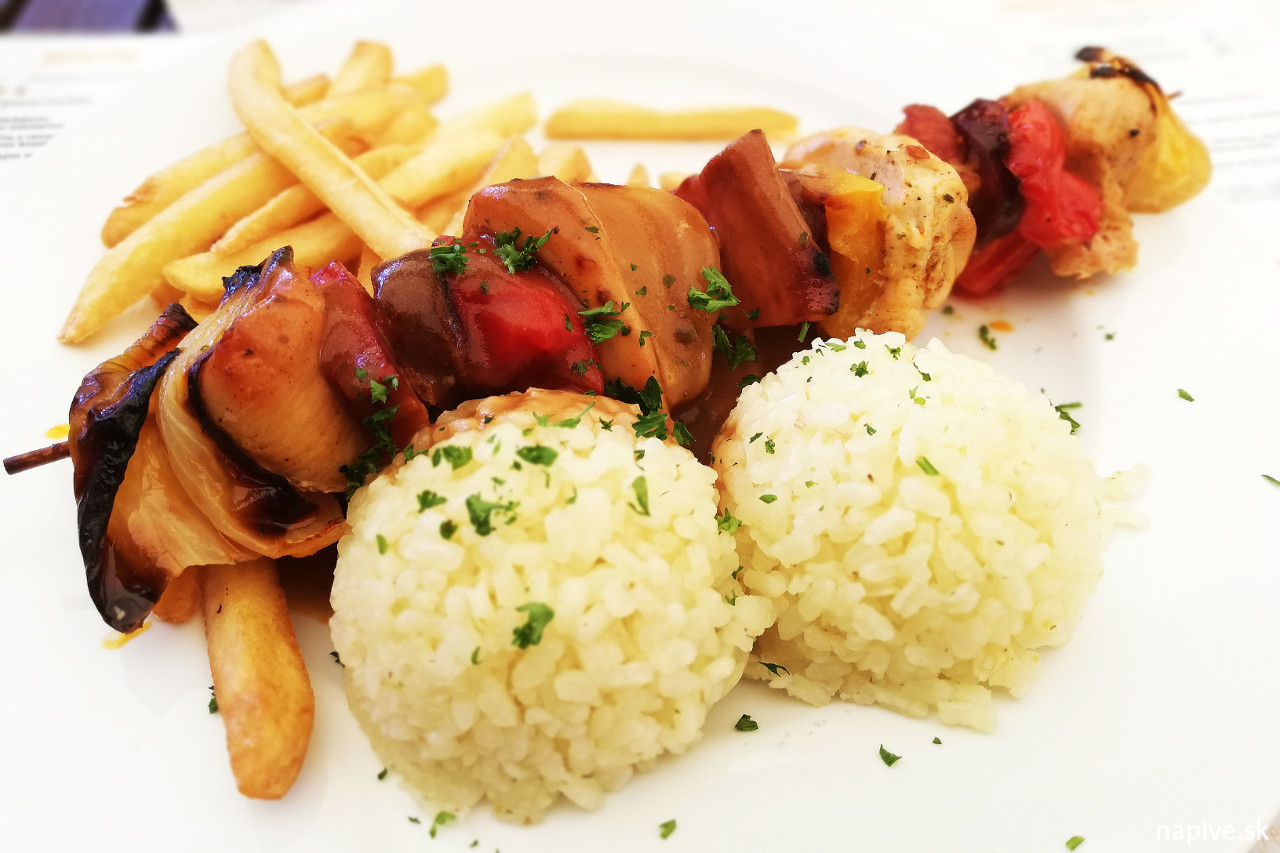 Bravčová panenka na špízi na Terase v Hlohovci. Nuž a poďme k tým obyčajnejším veciam. Táto panenka je tak obyčajná, že som veru premýšľal, či vôbec písať o týchto špízoch blog. Je to napichnuté na takej kovovovej tyčke, ale ktovie, či to bolo aj grilované, možno že aj predvarené a len potom osmahnuté na panvici. Ale nechcem konšpirovať. Proste taký normálny obed za 6,50 eura… ktorý však stojí 6,90 + 1,50, lebo web majú strašne zastaraný. Slaninka – dobrá. Cibuľka – ujde. Zelenina – málo. Nebolo to v menu, ale v lístku, ale v niektorých reštauráciách je to asi to isté.